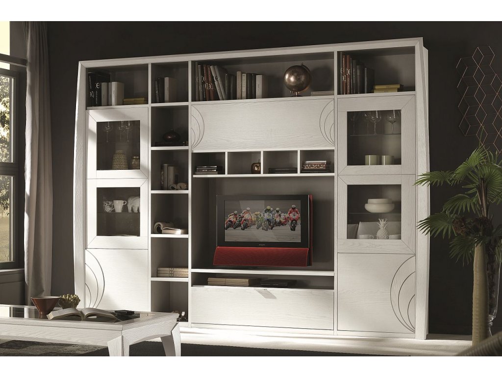 Bílá obývací stěna v moderním stylu dodá pokoji svěží vzhled. Stěnu tvoří skříňky s dvířky s plnou a prosklenou výplní, otevřený úložný prostor pro televizi, policové díly a ve spodní části jedna zásuvka. Dvířka skříněk zdobí jemné rýhování.