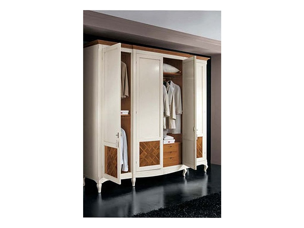 Čtyřdveřová šatní skříň 286x255x65cm s vykládanými výplněmi dveří a velkým úložným prostorem.