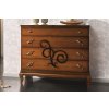 Komoda se čtyřmi šuplíky, na tvarovaných nožkách. Celkový vzhled zdobí stylové úchytky ve dvojím provedení a dekorativní ornament.