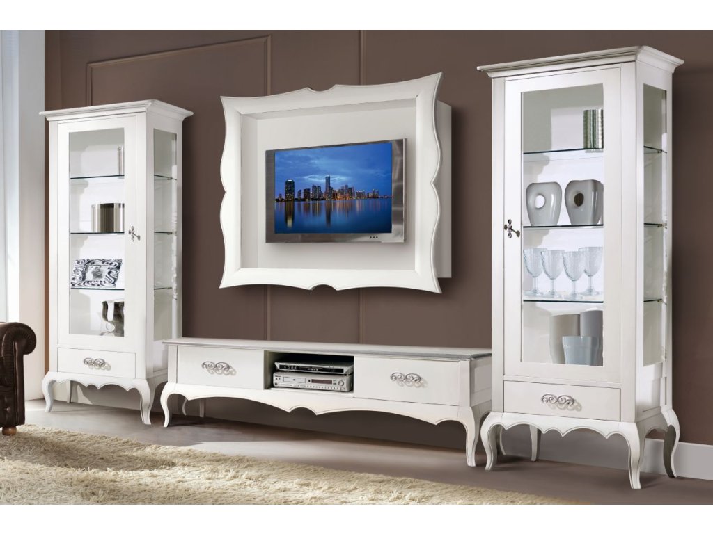 Obývací stěna v glamour stylu. Skládá se ze dvou prosklených vitrín se skleněnými policemi a zásuvkami ve spodní části, TV stolku se dvěma zásuvkami a otevřeným úložným prostorem. Součástí sestavy je i police s ozdobným rámem, vhodná k umístění televize. Celkový vnější vzhled skvěle doplňují tvarované nohy a designové úchytky.