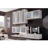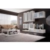 Obývací sestava s variací několika závěsných skříněk, policí a TV stolkem se třemi zásuvkami. Dvířka jsou vyrobena s výplní mléčného skla. Vnější vzhled skvěle doplňují designové úchytky.