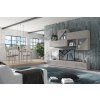Nadčasová obývací stěna šedá nabízí prostor pro televizi, drobnosti i dekorace. Sestava se skládá ze závěsných skříněk a širokého TV stolku se dvěma zásuvkami. Dvířka disponují praktickým bezúchytkovým otevíráním "push/pull" a jsou zdobena perforovanými ornamenty ve stejném odstínu.