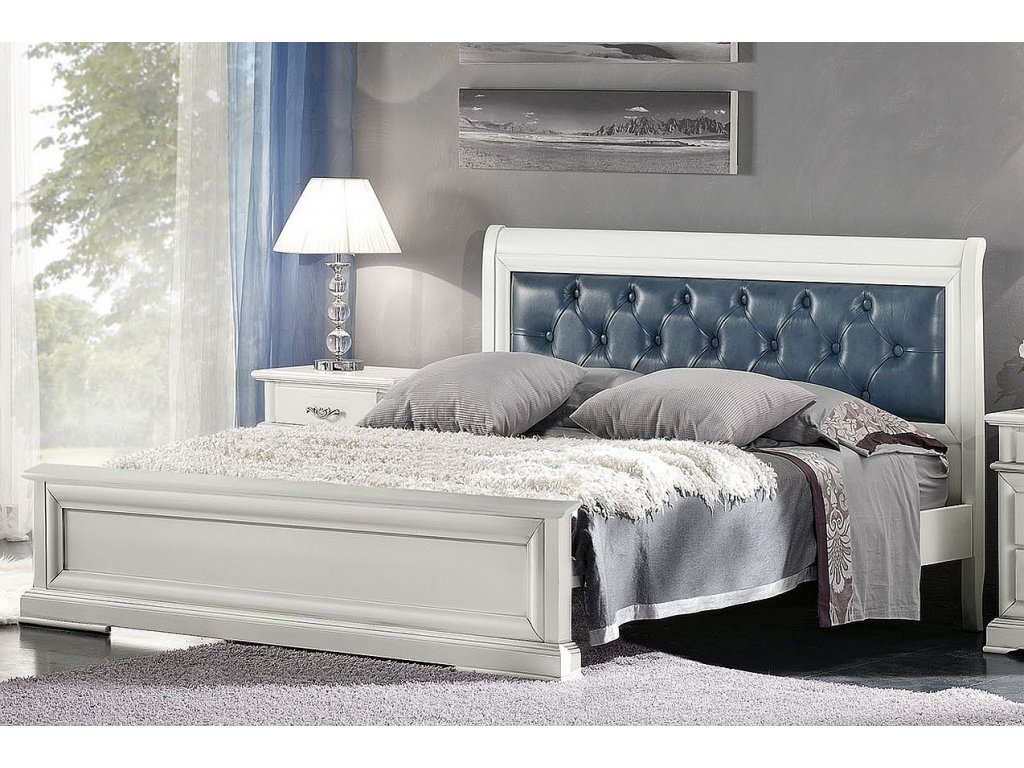 Postel o rozměru 160x195cm s čalouněným čelem. Vzorník látek nebo kůží pro očalounění čela postele najdete na našich stránkách. Postel je možné dodat v tomto barevném provedení i v dalších odstínech RAL a několika typech moření.