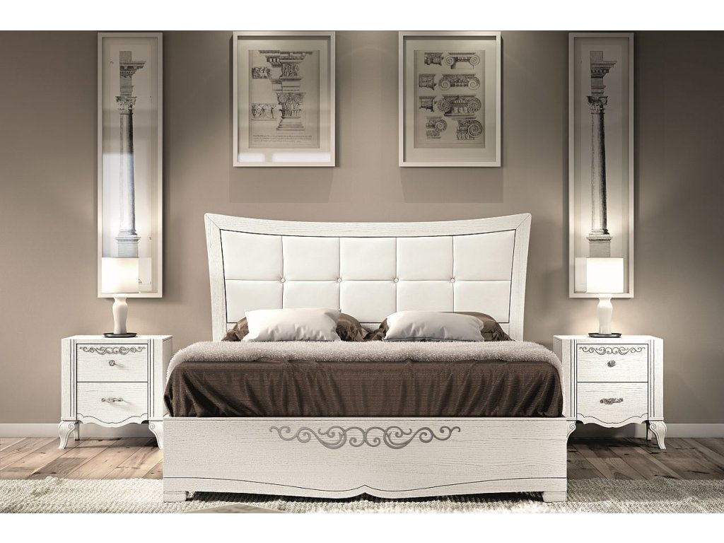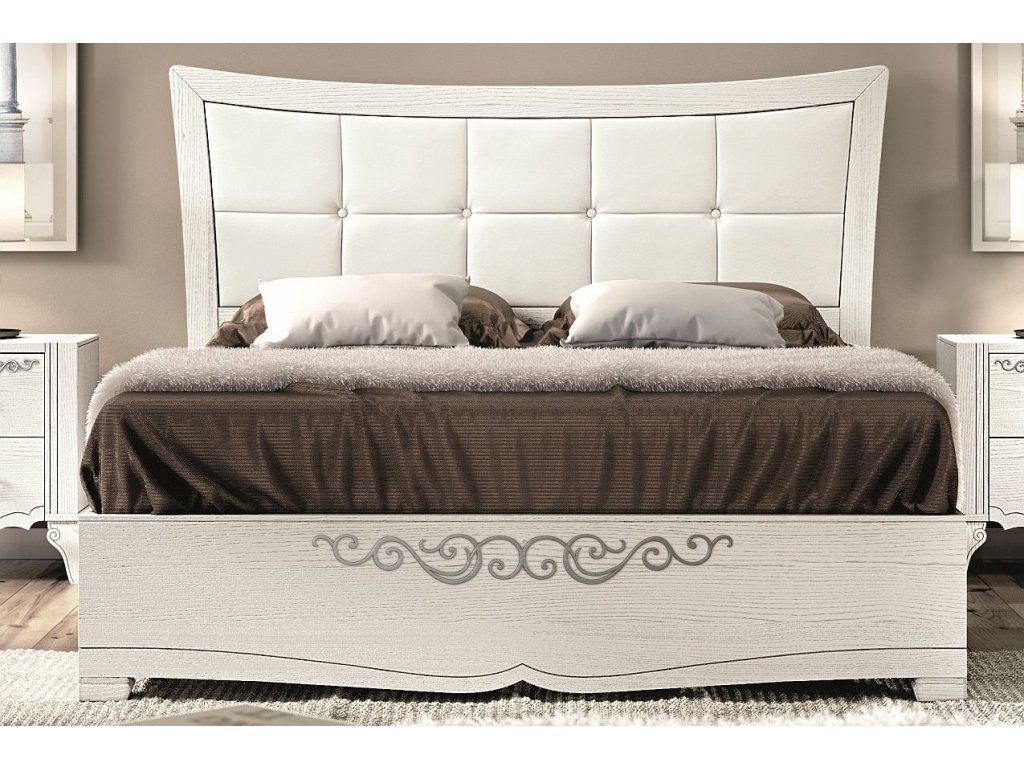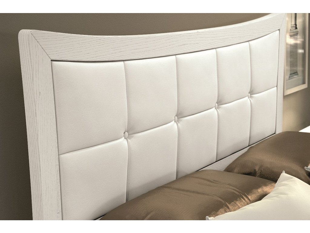 Postel z masivu s tvarovaným čalouněným čelem a kostkovaným čalouněním, na obrázku čalouněno bílou kůží.