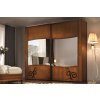 Šatní skříň se zrcadlem a dvěma posuvnými dveřmi v moderním stylu. Je vybavena sektory pro věšení oblečení na ramínka, policemi, otevřeným úložným prostorem a kontejnerem se třemi zásuvkami vpravo dole. Celkový vzhled dveří doplňují ozdobné ornamenty a designové úchytky.